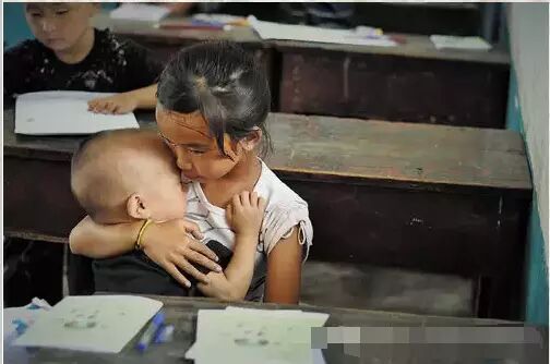 照片说明:这是一对农村小姐弟:一个约莫七八岁的小姑娘,怀抱着一个大约一两岁的小孩,背景则是正在上课的小学课堂。配图文字是“因为小弟弟闹困,正在听课的姐姐急忙抱起他”。这张图,瞬间感染无数网友,还有人试图对口资助女童。该图摄于湖南凤凰县山江镇一小学。照片中女孩叫龙张欢,今年10岁,弟弟今年只有2岁。女童父母外出打工了,爷爷奶奶要干农活,所以她才带着弟弟上课。也因营养跟不上,所以小男孩的头看起来比较大。