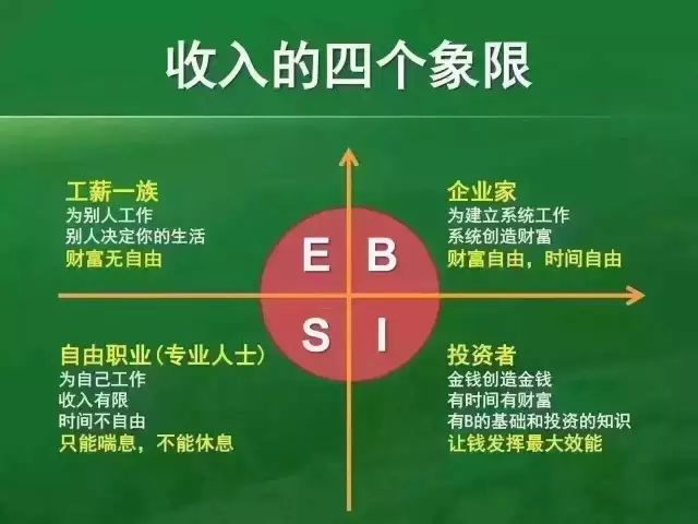 企业主象限(B):是生意拥有者人,他们同样是为自己而工作,但拥有一个系统,是让系统为自己工作,来杠杆他人的时间和金钱,他们通过系统为自己创造财富,拥有时间和财务自由。