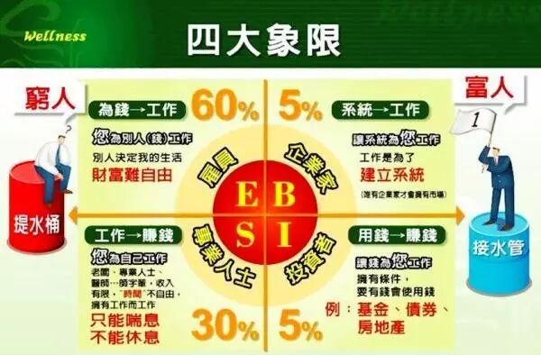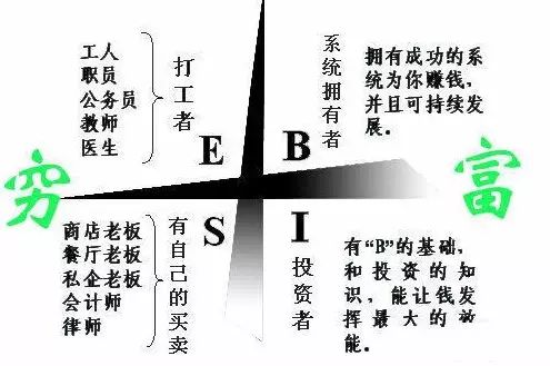 企业主象限(B):是生意拥有者人,他们同样是为自己而工作,但拥有一个系统,是让系统为自己工作,来杠杆他人的时间和金钱,他们通过系统为自己创造财富,拥有时间和财务自由。