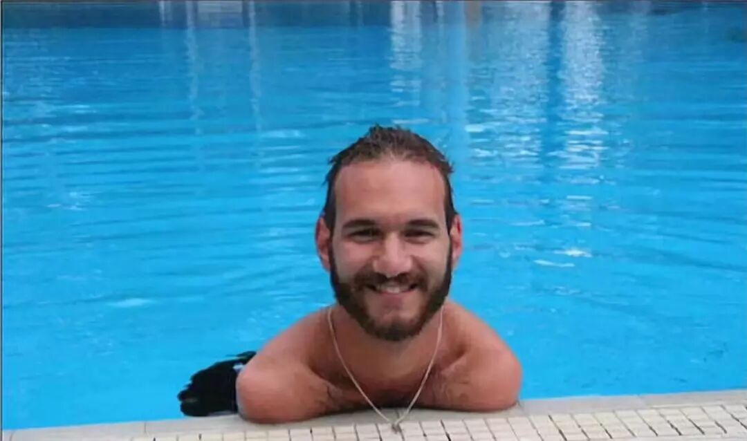 镜头中的尼克·胡哲虽然失去了四肢,但他仍选择笑对生活。
