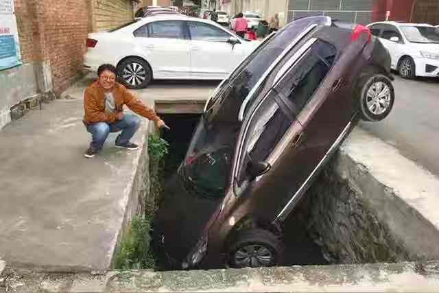 第二天一早,车主竟一脸开心地和自己掉进沟里的小车合影,留下纪念。